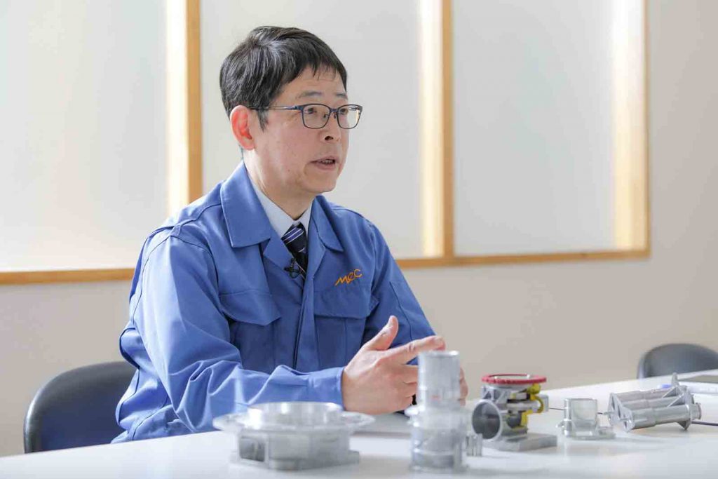 そして今取り組んでいるのが、アルミの鋳造時に生じるひずみの調整を自動ラインのなかで行う、という画期的な応力カットシステムの構築だ。ガソリン車と比べてEV車は、部品点数が1/3にまで減少すると言われている。EVシフトが進む今、メックがこの先も自動車部品製造で選ばれ続けるための準備は万全に整いつつある。